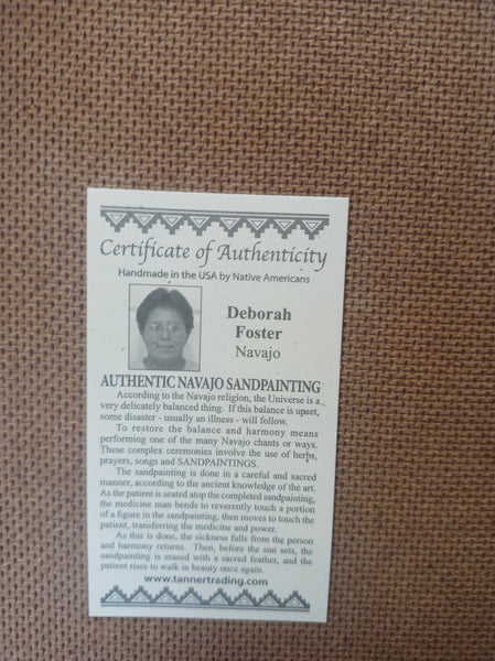Authentic sand painting by Navajo artist Deborah Foster. Measures 13" x 13" with frame and matting.