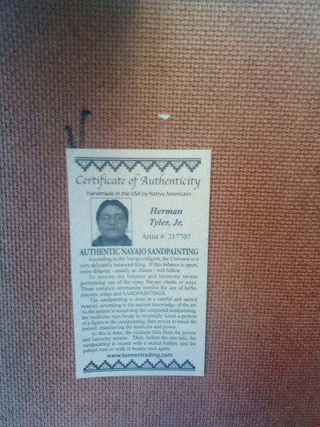 Authentic sand painting by Navajo artist Herman Tyler, Jr. Measures 13" x 13" with matting and frame.