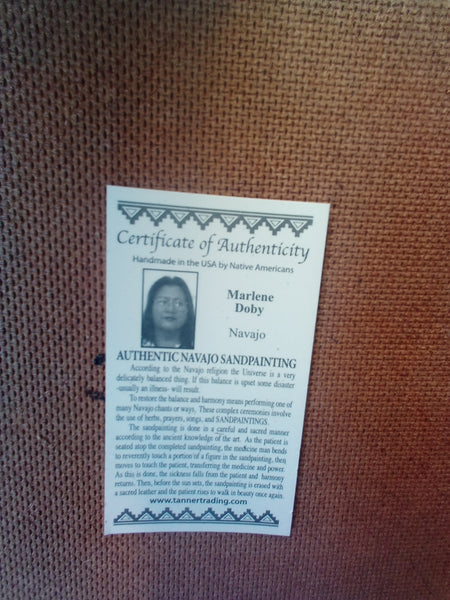 Beautiful sand Painting by Navajo artist Marlene Doby. Measures 13"x13" with matting and frame.