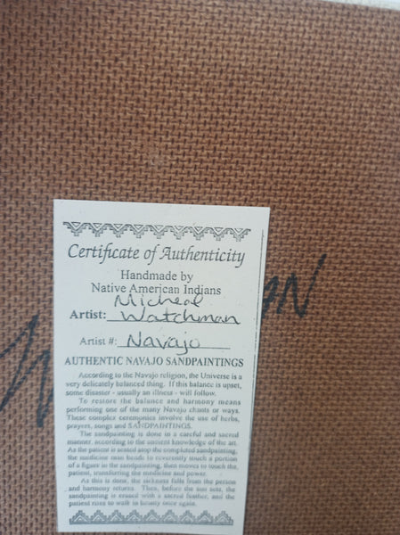 Authentic sand painting by Navajo artist Michael Watchman. Measures 13" x 13" with matting and frame.