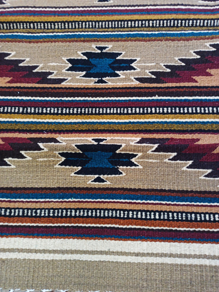 Genuine handwoven wool Zapotec rug from Oaxaca, Mexico. Great neutrals and a splash of turquoise make this little rug the perfect rug for your space. Measures 22" x 44".