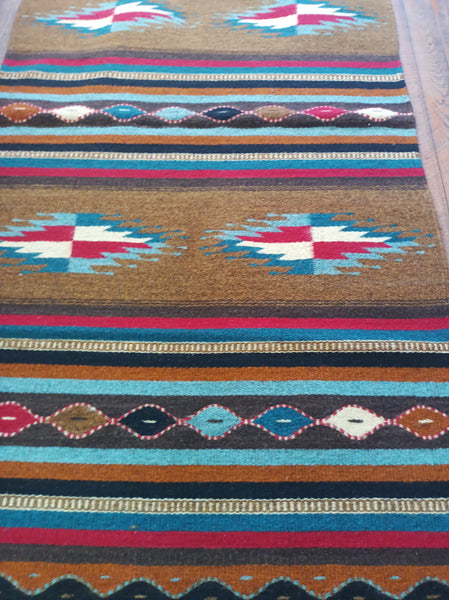 Genuine handwoven wool Zapotec rug from Oaxaca, Mexico. Colors include: golden brown, red, turquoise, teal, brown cream, rust and black. Measures 30"x60".